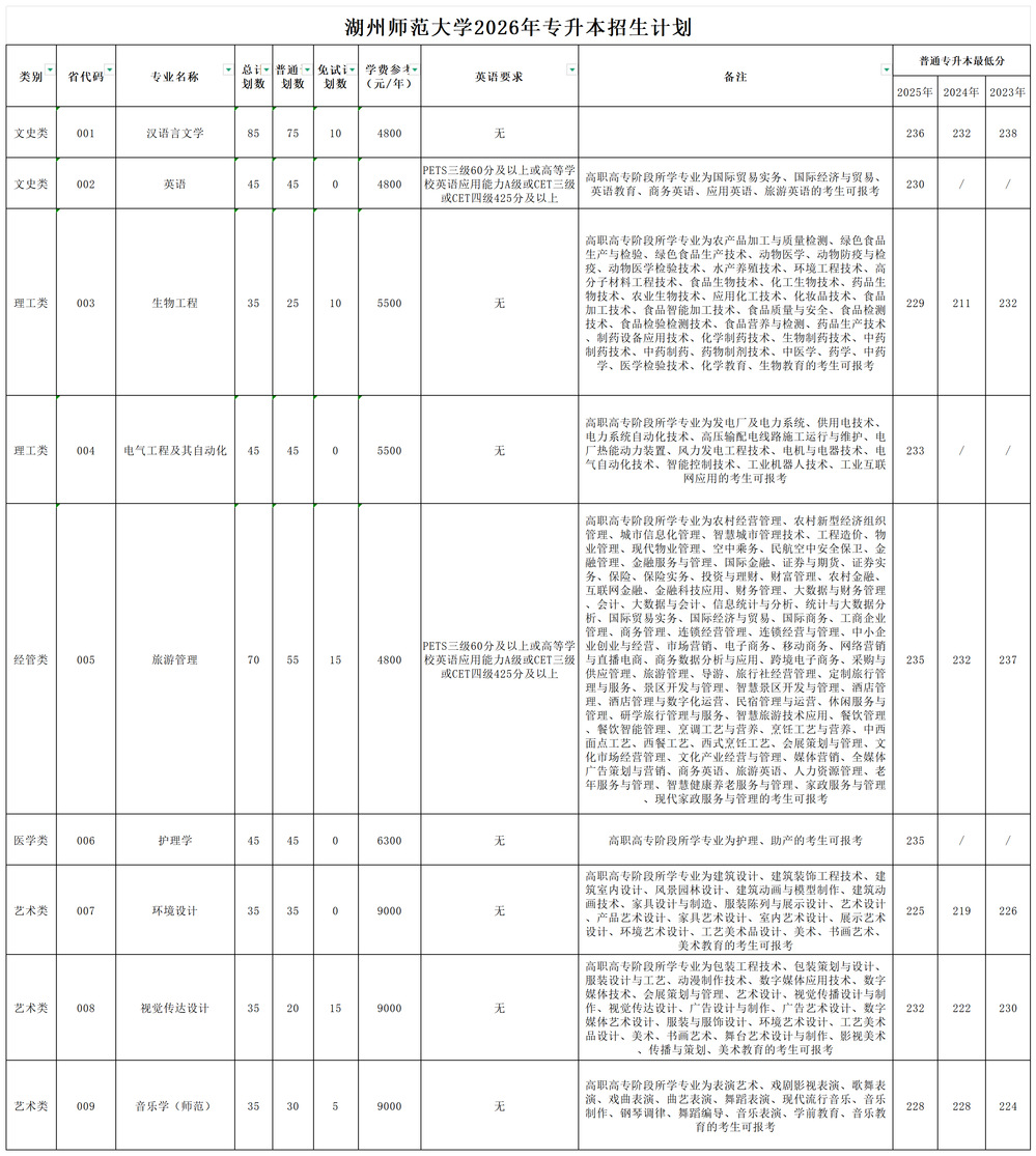 湖州师范大学2026年专升本招生计划